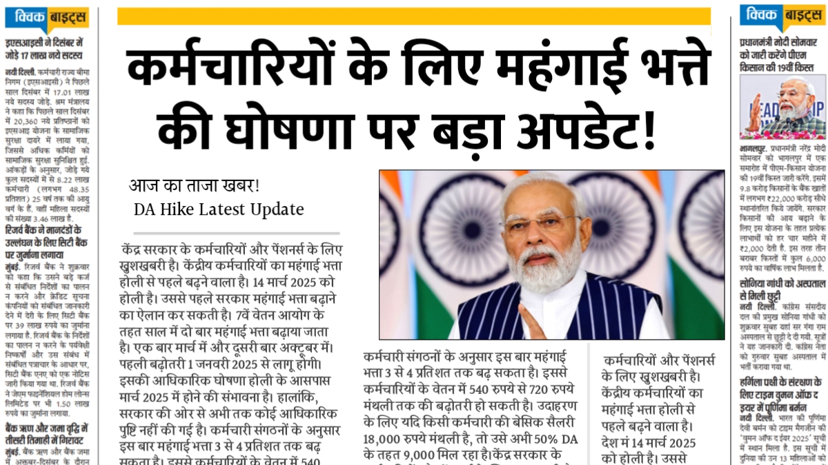 DA Hike: केंद्र सरकार के कर्मचारियों और पेंशनभोगियों के लिए एक बड़ी खुशखबरी है, क्योंकि जल्द ही महंगाई भत्ते (डीए) में संशोधन की घोषणा होने वाली है। सरकार हर साल दो बार जनवरी और जुलाई माह में महंगाई भत्ते में संशोधन करती है। इस बार भी जनवरी 2025 से प्रभावी महंगाई भत्ते में बढ़ोतरी की घोषणा अगले सप्ताह तक हो सकती है। इस बढ़ोतरी से कर्मचारियों की सैलरी में उल्लेखनीय वृद्धि होने की संभावना है।